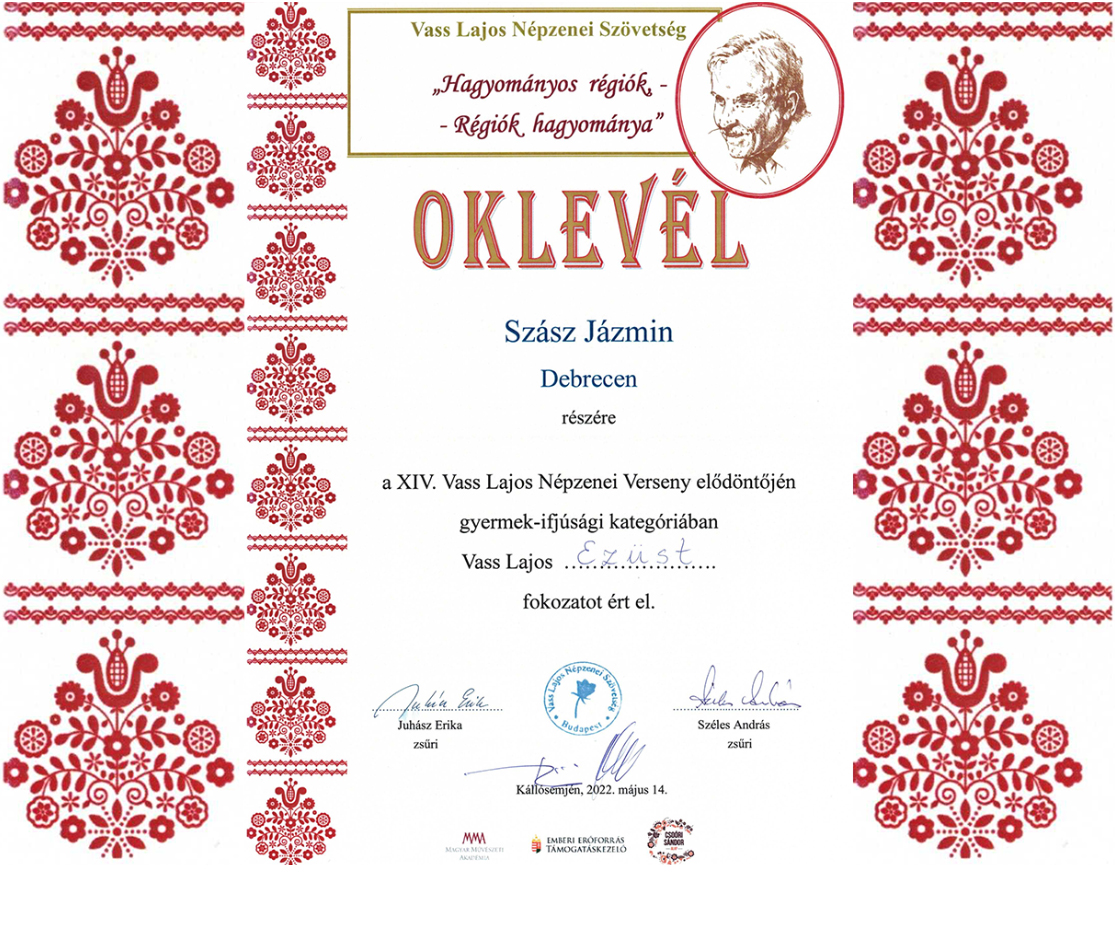 Növendékünk, Debreceni Judit ezüst oklevelet kapott a 2022. január 29-én megrendezett találkozón. Gratulálunk az elért eredményhez! Felkészítő tanára Lakatos Vera, akinek szintén gratulálunk! Zongorán közreműködött: Molnár Dániel.
