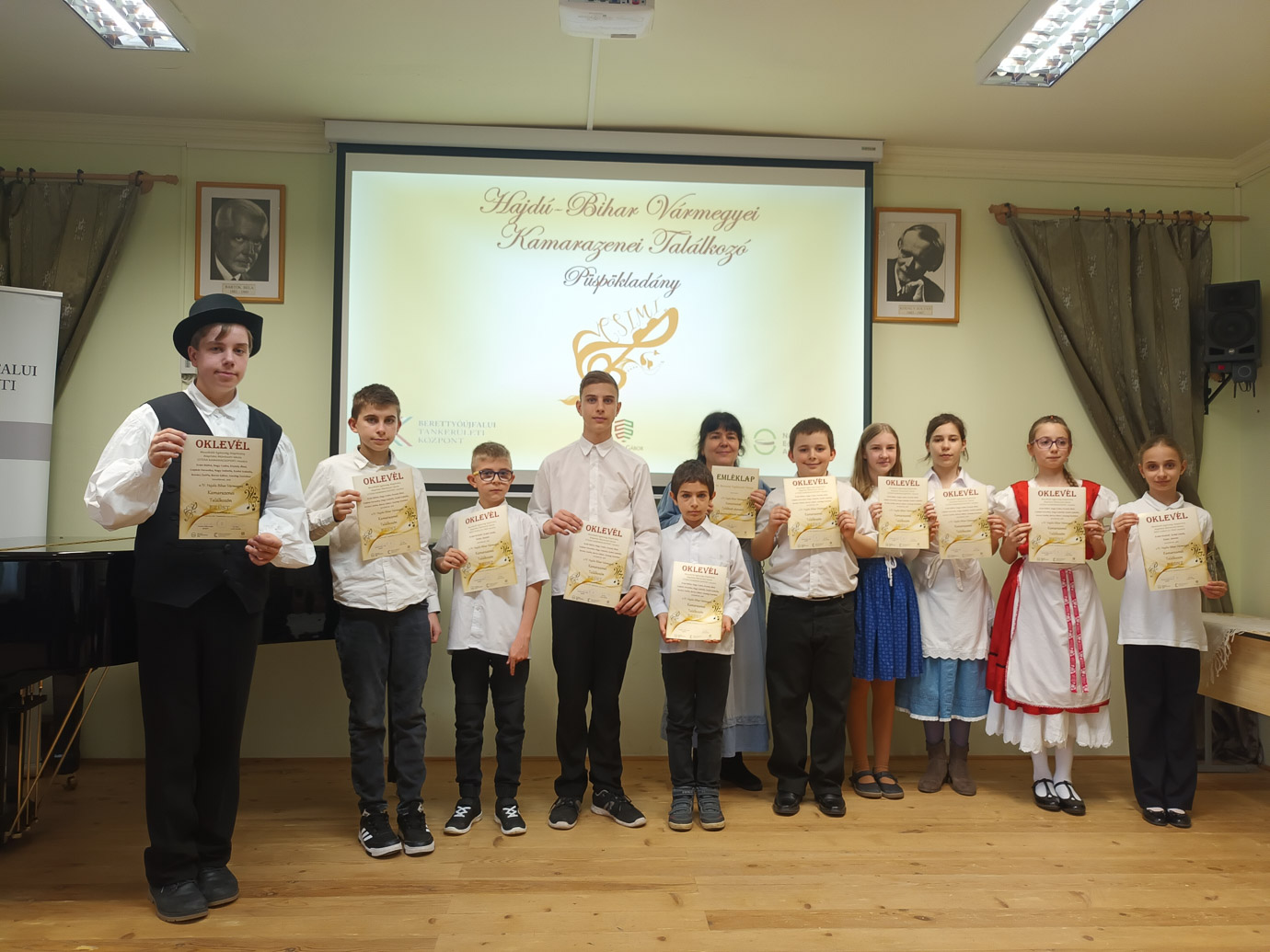 Március végén vett részt a népzenészek citerás-és furulyás kamaracsoportja a Püspökladányban megrendezett Kamarazenei Fesztiválon. A sokszínű zenei fesztiválon ügyesen szerepeltek tanítványaink. Furulyásaink bronz, citerásaink ezüst minősítést kaptak. Színvonalas produkciókat hallhattunk a fellépő gyerekektől. Gratulálunk a fellépőknek és a felkészítő tanáruknak, dr. Borosné Toplenszki Tímeának.
